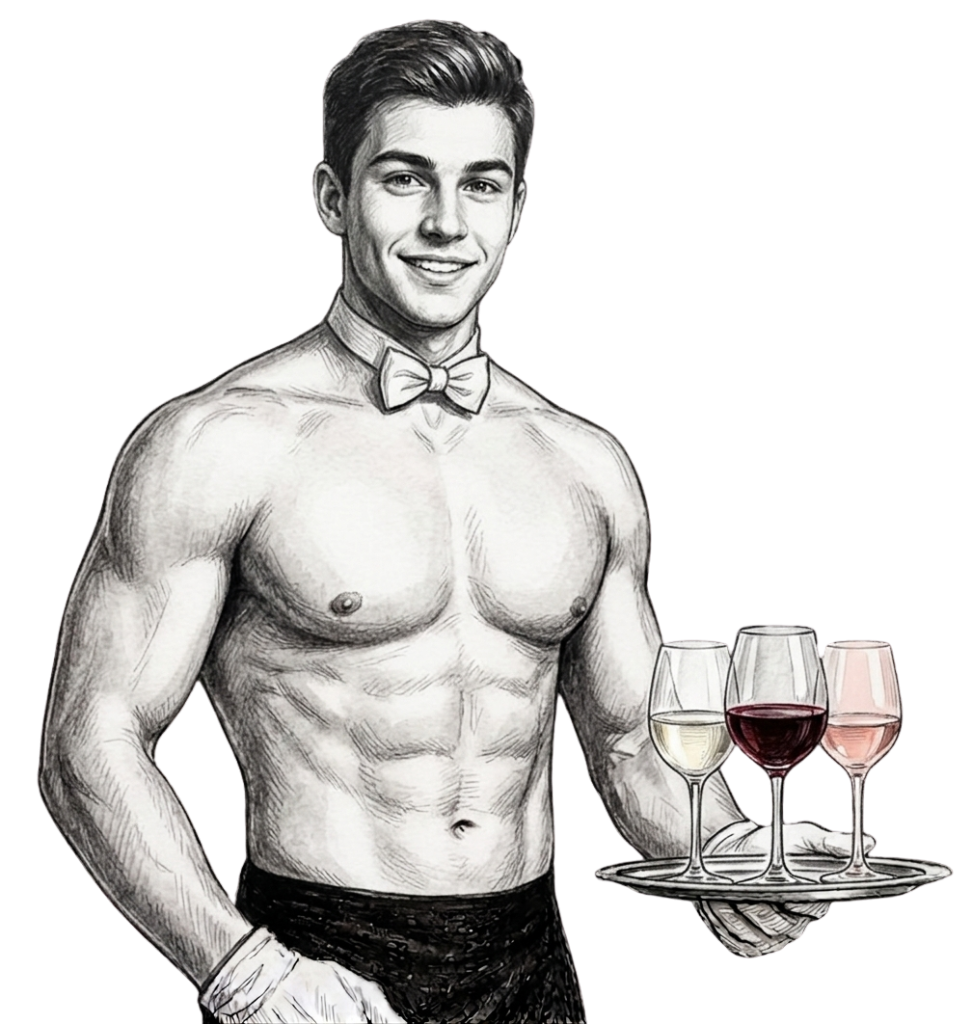 Upgrade your next event with our Cheeky Butler service. From the iconic ‘bottomless’ apron to a refined topless look in formal black trousers, our professional team brings the perfect balance of charm and class to your hosting.
